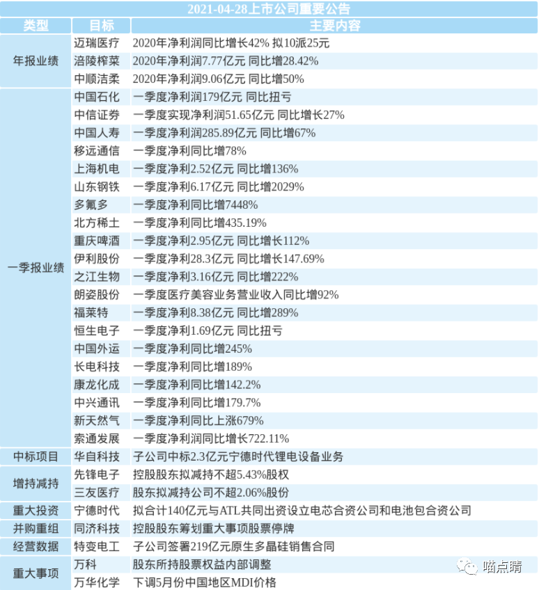3、迈瑞医疗2020年净利润66.58亿元,同比增长42.24%,拟10派25元,略超预报。2021Q1净利润17.15亿元,同比增长30.59%,创一季度新高。股东方面,药基女神葛兰新进成为公司第八大流通股东。整体业绩表现还是很稳,就是估值不算便宜。