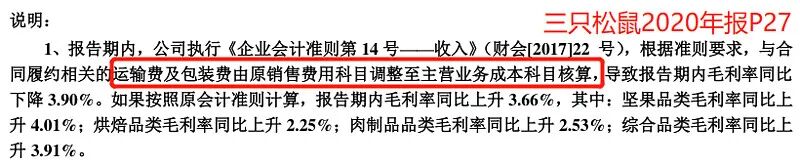 于是小组锲而不舍地在2020年报找到了“玄机”之所在:原来是2020年年报季会计准则口径做了调整,将包装费运费都从销售费用调整到了成本科目中列示(见下图)。