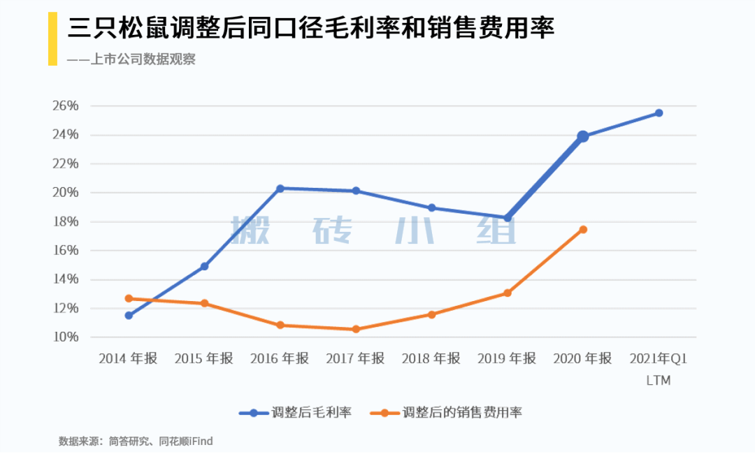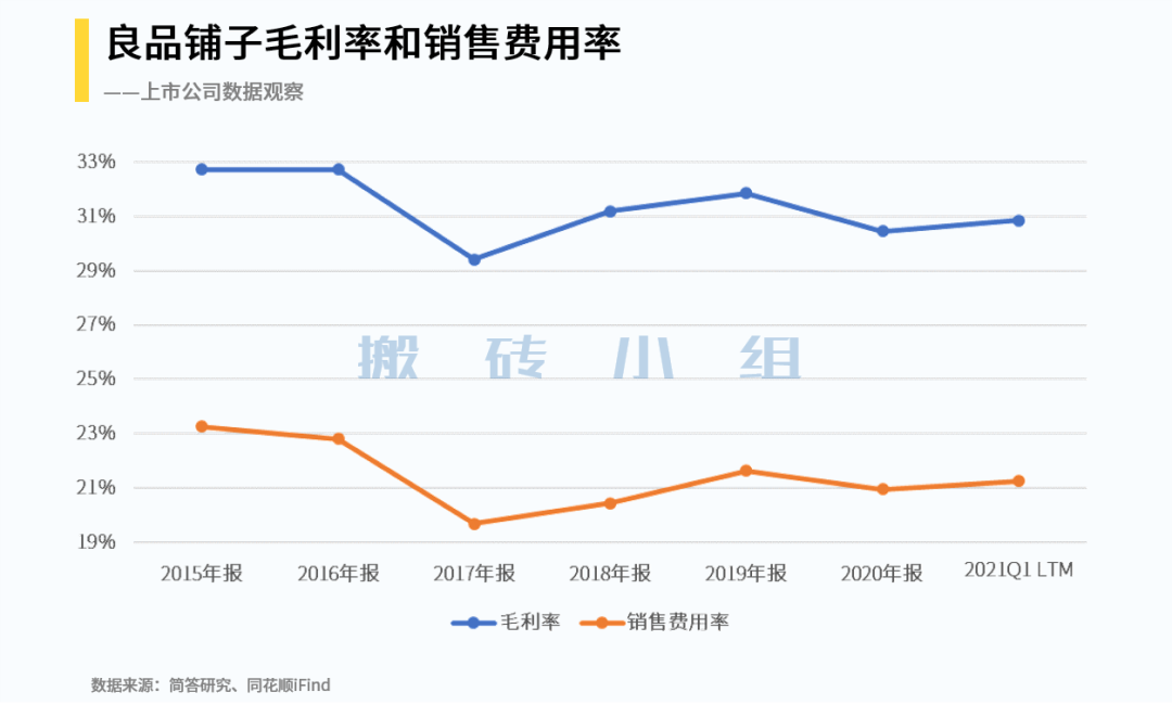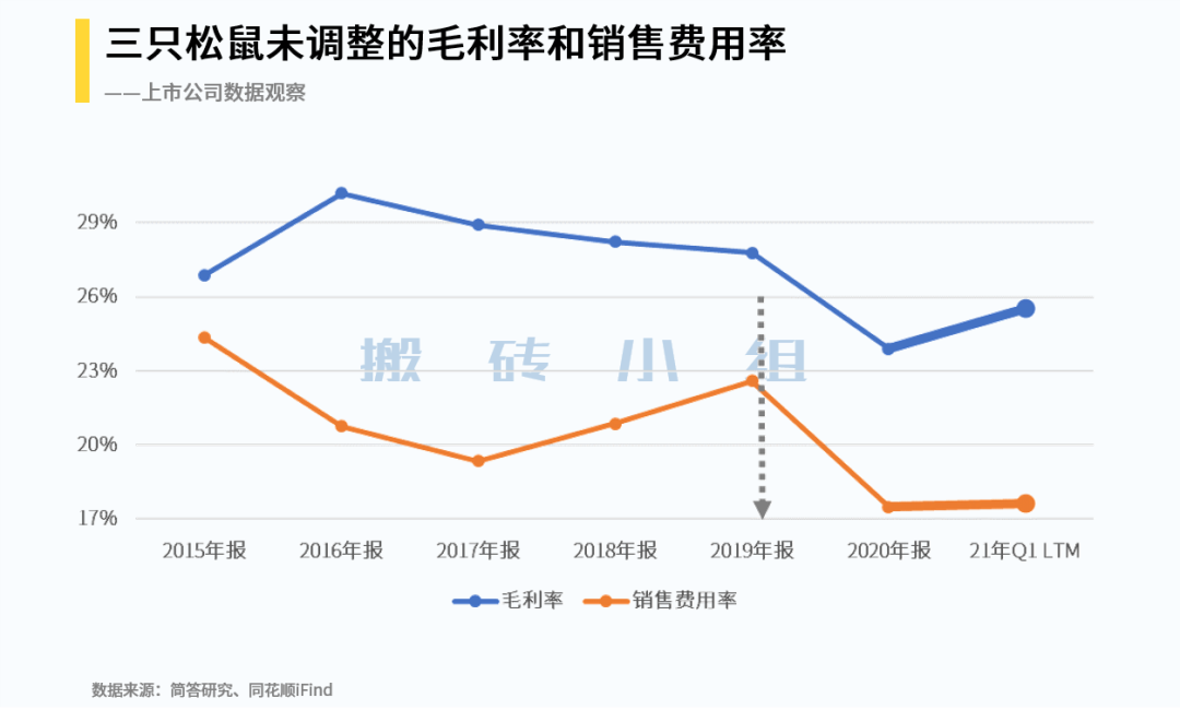 正好良品铺子今天也发了一季报,其包装运费自2020年以来还未采用新准则的调整,因此直接采用报表内的数据计算毛利率和销售费用率(只要同一公司内纵向保持历史口径一致即可);明显可以发现良品铺子的毛利率和销售费用率在2020年是轻微下降的,平移到2021年一季度也依然保持稳定。