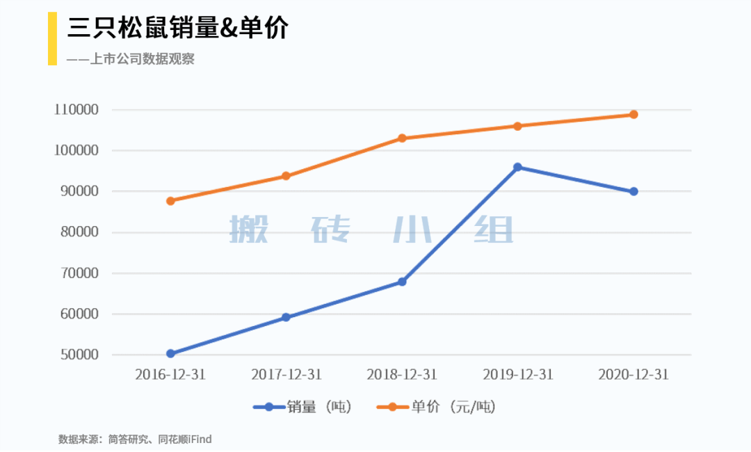 由于毛利率主要跟价格成本有关,于是小组反手就算出个销量和单价(元/吨)——结果也是鹅妹子嘤(amazing~长期号称低价低毛利、走亲民路线的三只松鼠,原来早早就已经踏上涨价之路了吗?!吓得我手里的腰果都不香了~