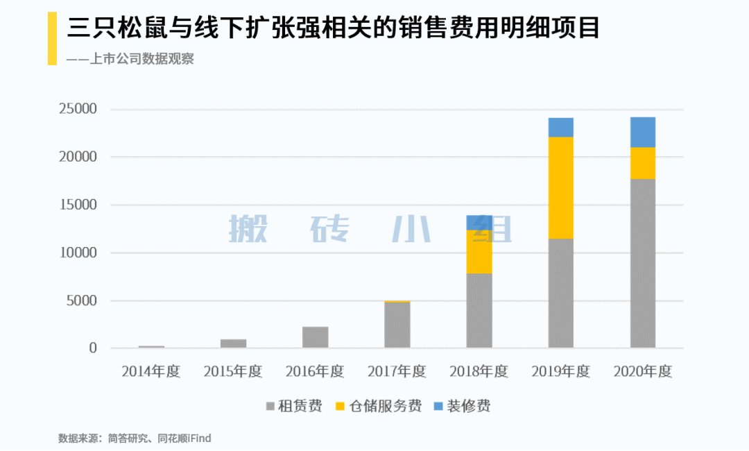 另外,在券商研报层面叫得很响的“战略转型线下”,这个事情也可以从两方面去做数据跟踪,一个维度是观察跟线下扩张强相关的销售费用明细,主要就是租赁费、仓储费和装修费;但除了租赁费清晰的连续增长之外,仓储费和装修费到2020年是明确减少的,不知道这点是不是跟公司选择直接租赁现成场地有关?然而即便是这样,租赁费+仓储费+装修费三者合计的费用在2020年来说,相对2019年也并未增长,所以估计要等2021年半年报出来才能看到是否在2021年有所增长了。