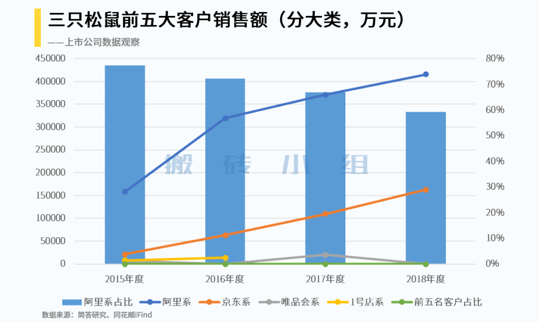 在2018年以前公司有披露前五名客户的明细,全部都是电商,还可以按照明细区分出几个电商大类的(比如阿里系涵盖天猫商城、天猫超市、浙江天猫供应链管理有限公司、零售通等),从图里可以发现在2019年以前,除了阿里之外,京东系电商增长比较稳定,推测在天猫上的销售份额能否在2019年之后被京东之类的电商、或者真如公司所说的线下门店扩张取代了呢?