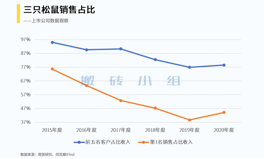 因为公司是靠线上销售起家,那么我们还可以从前五名客户集中度来侧面感知线上销售情况,可以发现前五名的销售集中度虽然是在下降的,但到了2019年依然还有77%的集中度;第一名客户(其实就是天猫商城)的销售占比到2019年占整体收入的37%,到了2020年还稍微回升到44%。