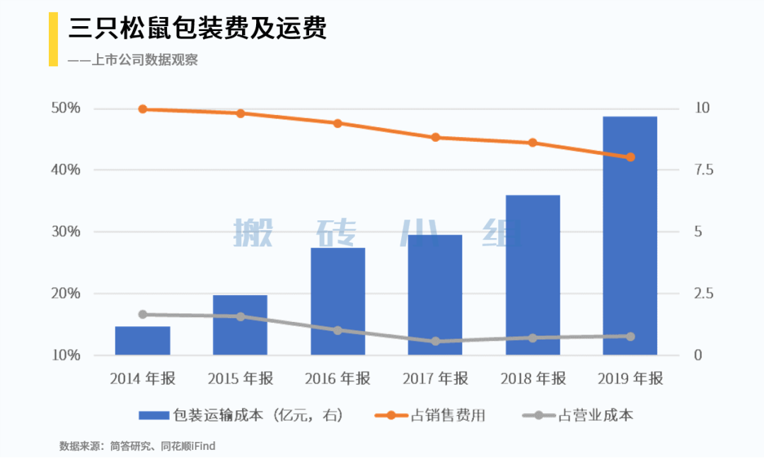 结合前面平均单价稳步上升的图,这就让人非常好奇了:电商休闲零食这种消费品行业,又没有特别深的品牌护城河,凭什么同行不涨价的情况下三只松鼠反而能涨价呢?