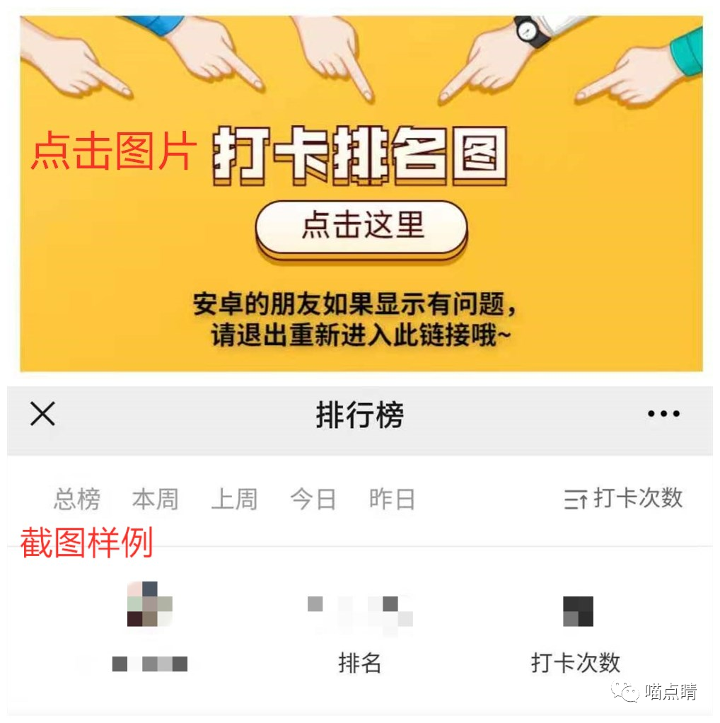第一步,点击打卡排名图,进入链接,截图自己的排名信息,注意截图只需要截图最上面的排名信息就好,不需要找到自己在下面具体的排名位置,如下图: