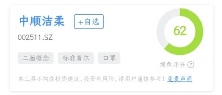 中顺洁柔的财报助手打分是62分,财务优势标签有【毛利率领先同行】、【收入连增三年】、【资产周转快】等,风险标签大伙可以点击下面的摸鱼财报助手查看: