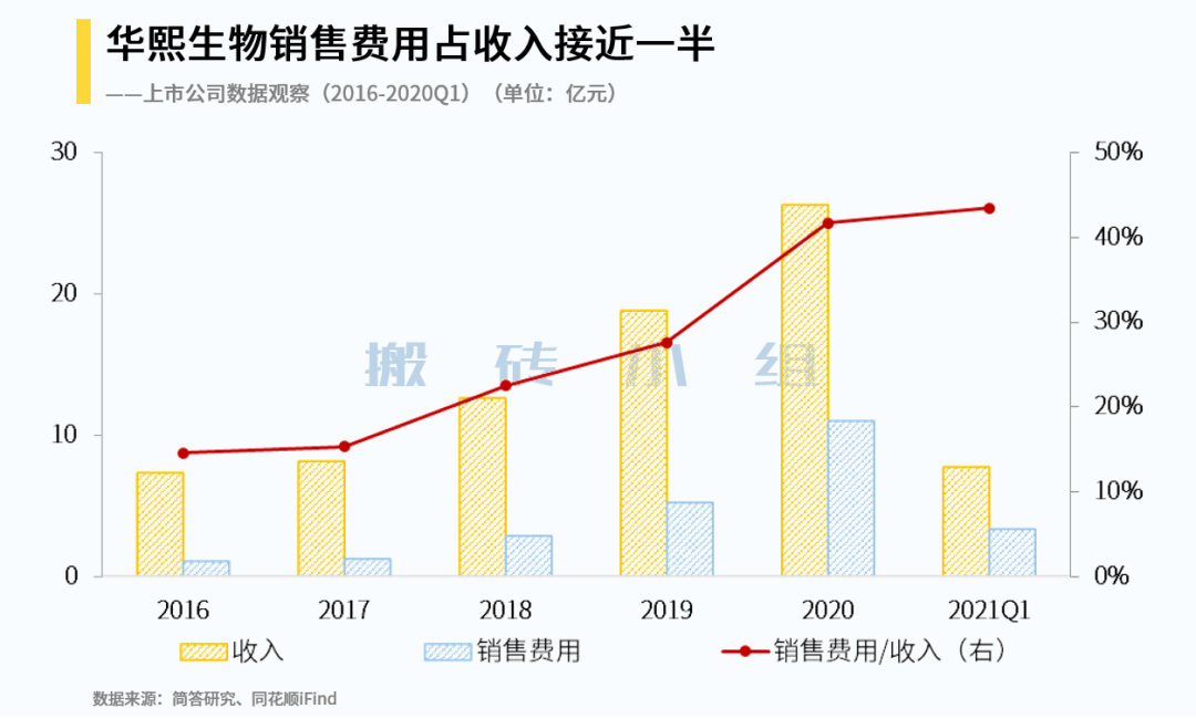 华熙生物这种努力推广的倾向,体现在财报上,就是销售费用的猛增,2020年销售费用达到11亿元,相比2019年增长111%;2021年一季度销售费用达到3.38亿元,增速为205%,销售费用占收入的比重已经将近44%,都快把一半的收入花在销售费用上了。