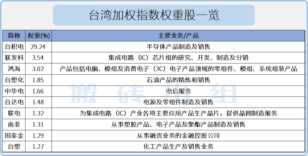 湾湾加权指数的构成,台积电,第1大权重股,将近30%权重。。。这是真的重!前10大权重股有5个与半导体、电子产业制造有关,3个与石油、化工生产有关。