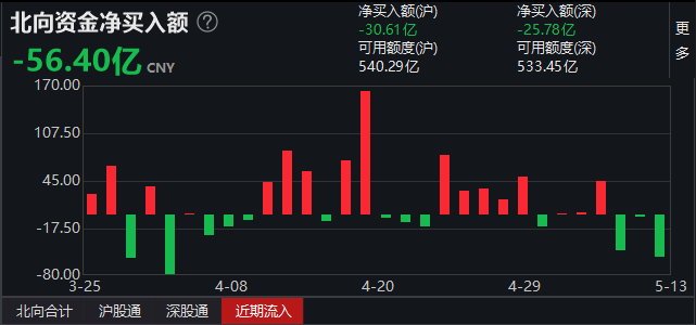 北上资金今天继续流出56亿,截止到今天已经连续流出3天且超过100亿,所以当前对北上资金态度的判断转向偏空。