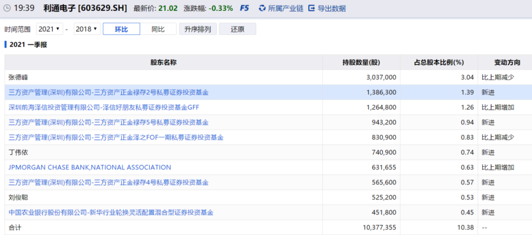 我观察到利通电子的股东很有特点,2021Q1的十大流通股东换了很多,其中4家都属于同一方——三方资产,有三家都是新进的十大流通股东,在三家新进的同时,另一家在减持,这就是想分散持仓的意思,三方资产的实控人是李海山,李海山还曾在利通电子第三大流通股东深圳前海泽信投资担任高管。