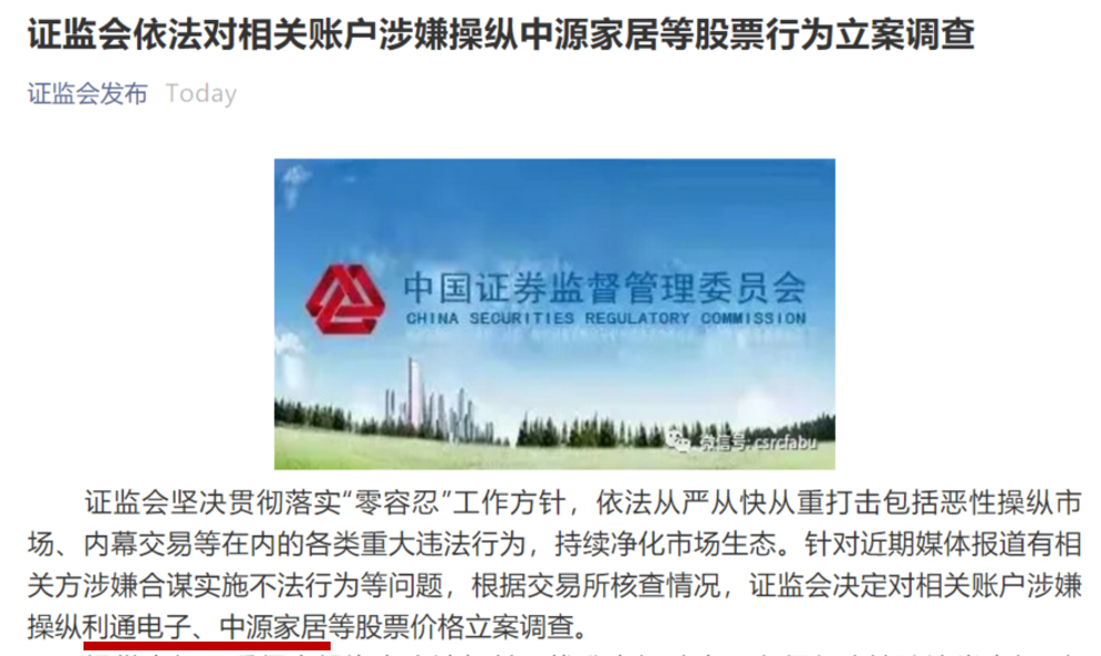 这里面有一个值得注意的地方,监管今天发通知,决定对相关账户涉嫌操纵利通电子、中源家居等股票价格立案调查,点名两家公司。