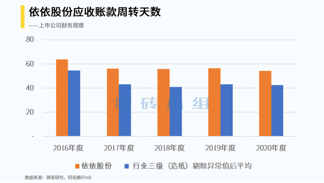 50-60天的应收账期,乍看起来对于消费品ODM厂商来说好像还挺快的,但在申万三级“造纸”行业内,剔除异常值后,能看出这样的周转天数(下图橙柱)其实相比行业平均(蓝柱)来说,是偏慢的。