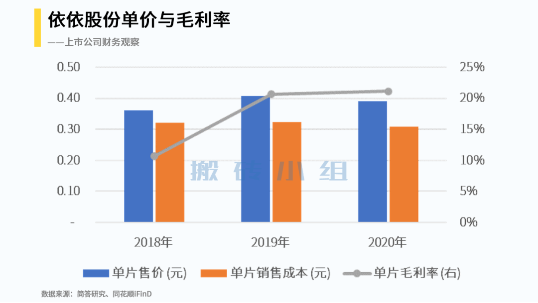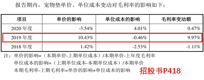 首先看核心产品“宠物垫”的获利情况:如下图,产品单价从2018年0.35元/片上升到0.39-0.41元/片,单片毛利率从10%上升到21%。
