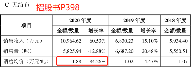 答案是上图灰色块的无纺布,其毛利率在20年跳涨到50%,原因也是众所周知:无纺布是防护服等防疫物资的原料之一,20年产品均价大涨84.26%(见下图)。