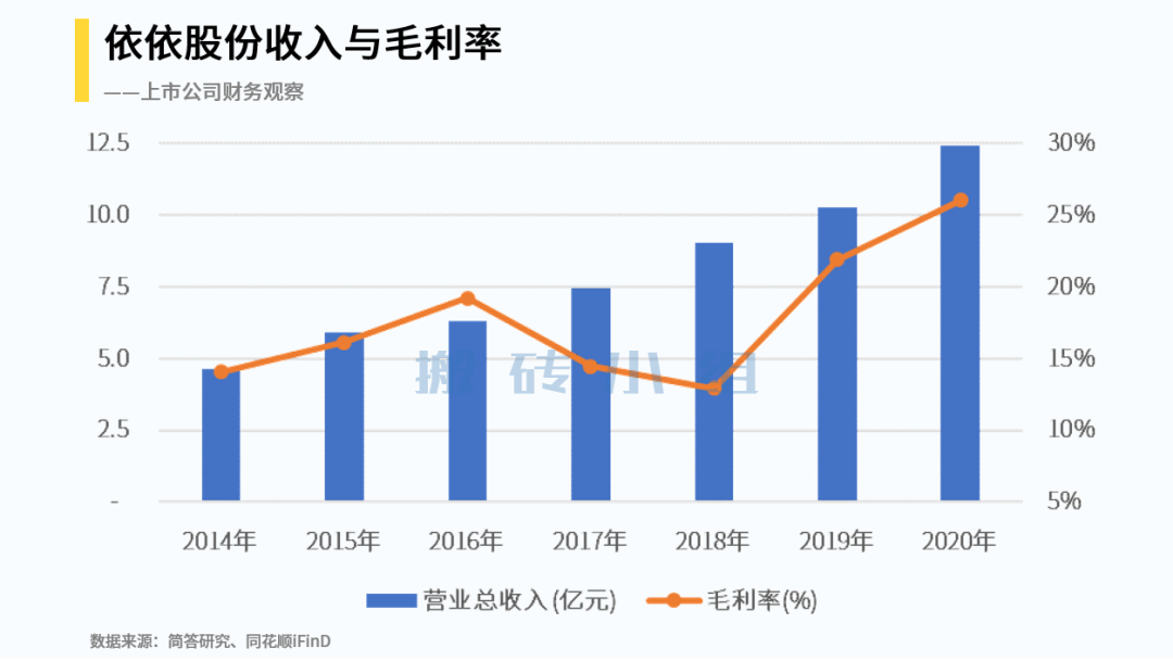 资金周转慢,如果盈利能力足够强也还可以。但依依股份的整体毛利率在14-18年都偏低(不到20%,下图橙线),到19、20年才上升到22%、26%,那这种毛利率提升能持续吗?