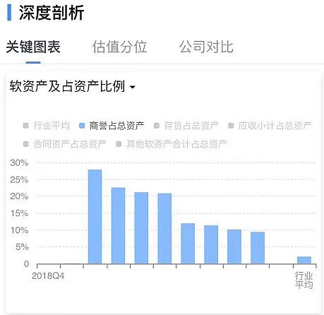 该交易支付方式包括2.55亿现金+价值14.45亿的股份,合计17亿的对价也同时形成了13亿商誉,对应净资产“账面原值”的估值倍数P/B为7.95倍。商誉如此之高,也难怪在“关键图表”部分可以看到,兆易创新的总资产中商誉占比远高于行业平均。