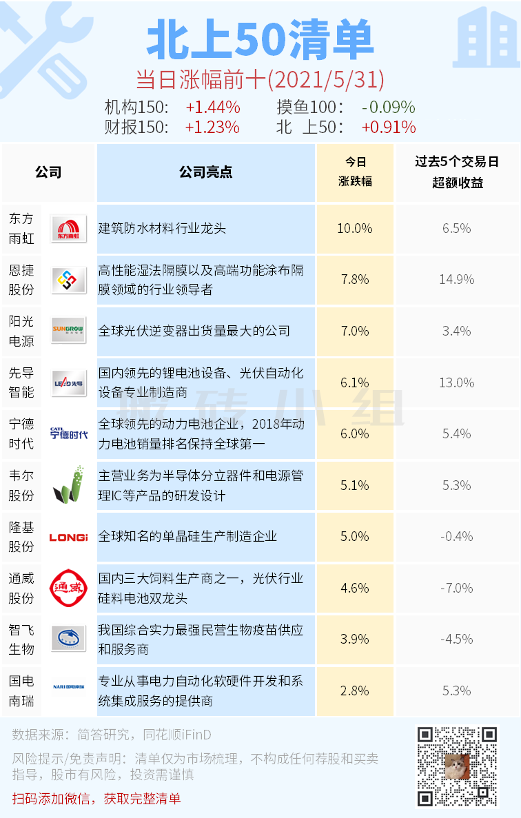 北上50上榜的一大批都是新能源,这块现在就是趋势主升,跟图就行了。唯一涨停的是东方雨虹,这算是建材中的茅台了。传统行业里由于马太效应,大公司会变得更强,雨虹、三一这种就是非常典型的,这种阿尔法策略的总结我最近也在研究,等做完了跟大伙儿分享一下。