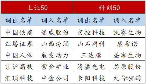 3、上交所决定调整上证50、上证180、上证380、科创50等指数样本,于今年6月11日收盘后生效。每个指数都将更换10%的成分股,资金关注度较高的上证50和科创50更新情况如下表:
