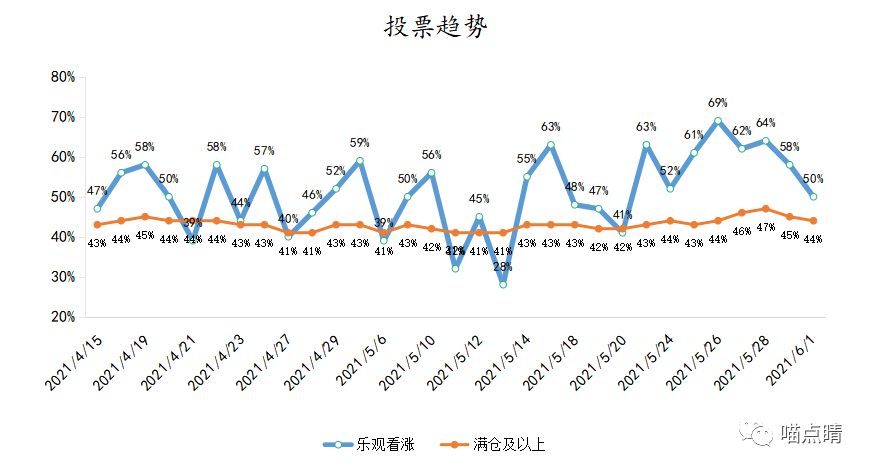 昨天投票趋势“乐观看涨”降至50%,市场情绪较弱。
