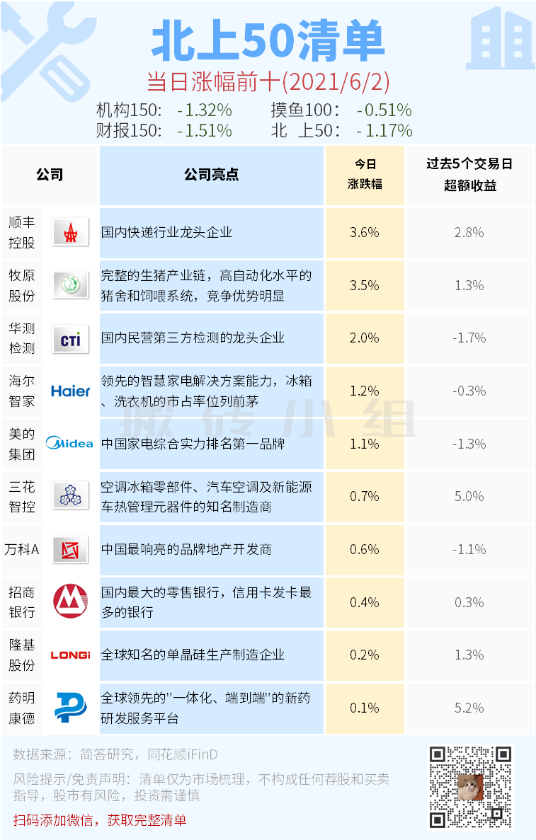 北上50榜单今天表现比较差,整体涨幅不太好。涨幅第一的是顺丰,Q1出大雷以后跌了很多,最近开始反弹,记得当时的会议里公司说Q2不再会发生同样的事,最近买入的资金应该是冲着中报改善去的。