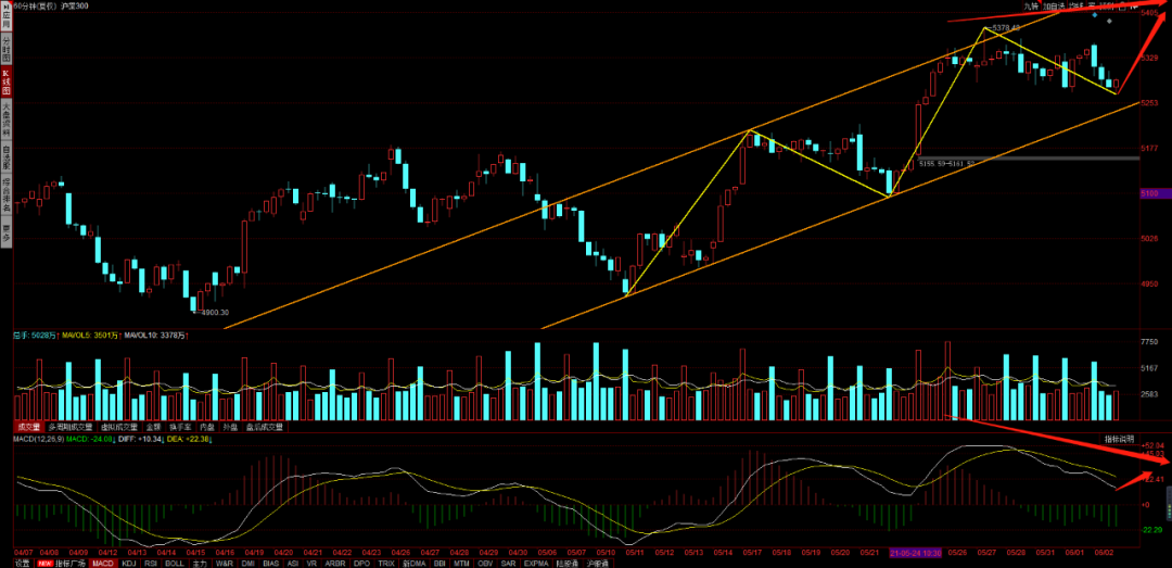 但这里要注意,最近沪深300的调整是60分钟的4浪,如果向上反弹就是5浪了。如果新高后力度不足,或者没有明确主线,那么极有可能会出现背离,到时候得注意这一轮反弹结束的可能。
