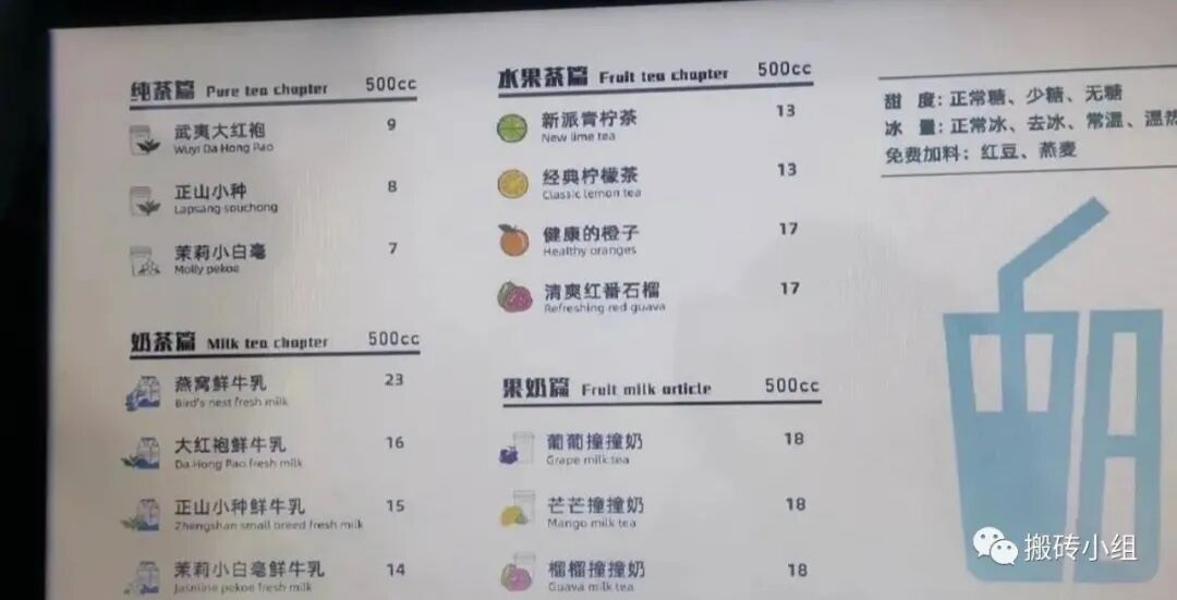 现在产品也包括了像正山小种这样的传统茶,8块一杯。邮政跨行做奶茶,不缺地,也不缺钱,邮政系奶茶店家里就有一位银行爸爸,邮政现在切进来,缺的主要是供应链和产品力。