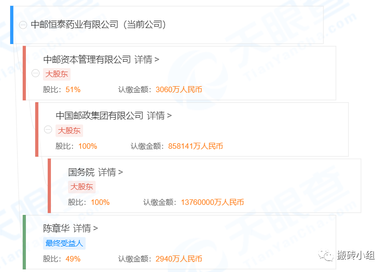 超级大地主中国邮政出来开奶茶店,商标主要是“邮氧的茶”,有两个关联主体,中邮恒泰药业和另一个一堆自然人的运营公司。目前中邮恒泰药业有限公司已申请注册该商标,其大股东为中邮资本管理有限公司,再往上就是中国邮政集团,另一个自然人陈章华感觉很有故事,能跟超级企业做这么深的合作。