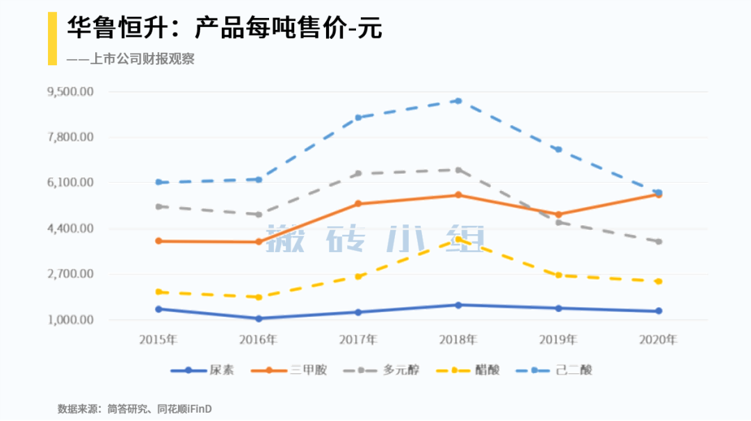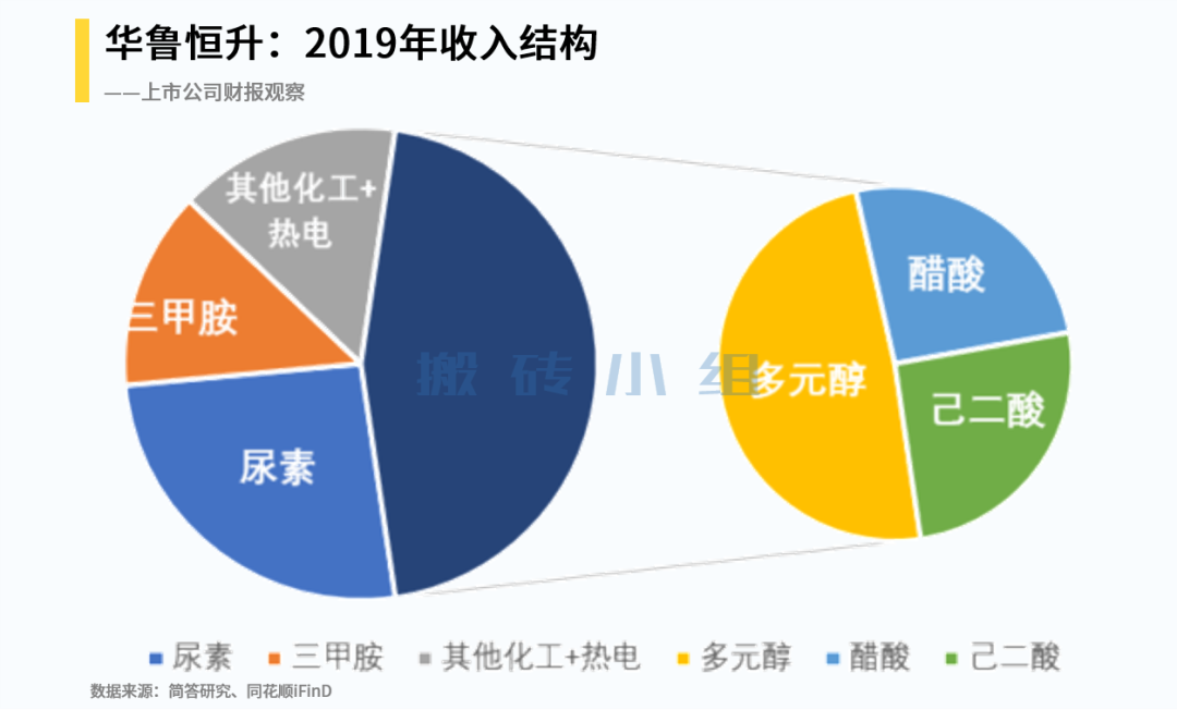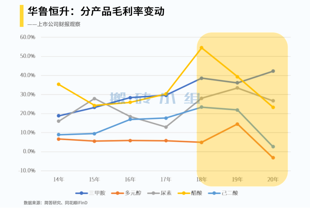 在2019-2020年,尿素和有机胺毛利率保持稳定,产品毛利率出现下滑的是:醋酸、己二酸、多元醇,这部分产品在2019年收入占比较多、合计贡献45%,其毛利率下降对整体的影响不容小觑。