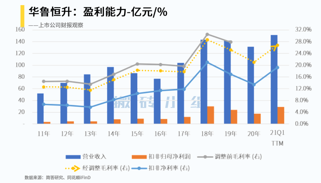 小组首先取得过去10年的盈利状况。公司收入规模从2011年50亿上升到2021年一季TTM的150亿,但2018-2020年收入增长较为缓慢、也难怪触发了“主业发展慢”这一标签。