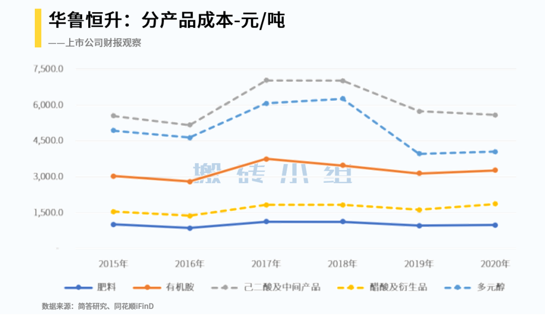 从2018年到2020年,多元醇平均成本下降35%、与销售端降幅基本一致。而己二酸仅下降20%,醋酸成本甚至微涨3%,表明公司在成本端承担了更大压力。