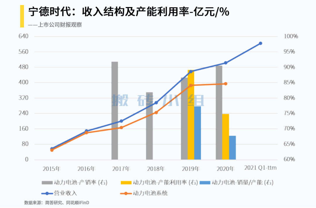 我们首先观察收入结构和产能利用情况。如下图,宁德时代的营业收入主要来自“动力电池”,2019、2020年度披露的产能利用率(下图黄色柱子)分别为90%、75%。