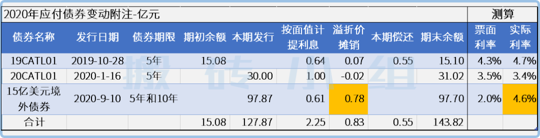 宁德时代于2020年通过境外主体发行了15亿美元债券,票面利率测算尽管看似仅有2%,考虑“折价发行”导致的大额摊销,实际利率约为4.6%(提示:摊余成本法“利息调整”摊销)。
