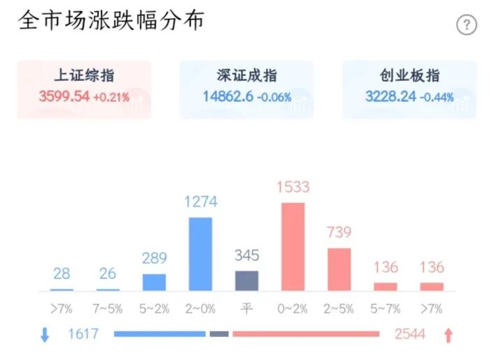 今天市场窄幅震荡,各大指数都收了根小星,不过上涨家数还是达到了2500家,这个盘面还是挺不错的。