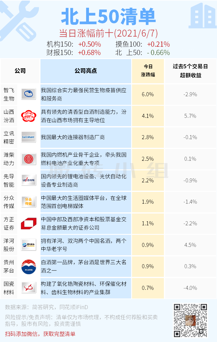 北上50榜单今天表现比较一般,50只票只有13只是红的。涨幅榜里汾酒继续创新高,不得不说,高增速的白酒真的太牛了。