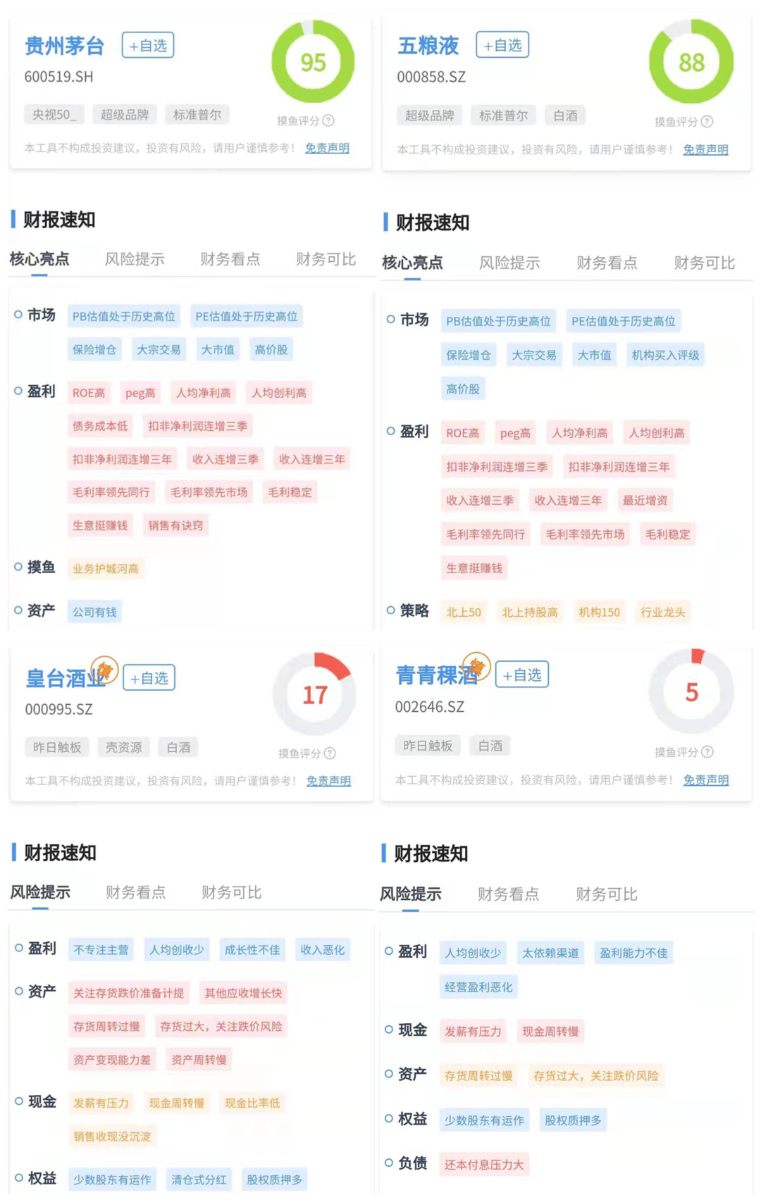 其实财报助手除了看分数外,还有很多玩法,说个我最常用的”财务可比”功能。大家都知道茅台牛,那么和茅台财务情况高度相似的同类学霸都有谁,就是一个很有价值的问题。而反面看,如果把这个功能用到一个财务炸雷的公司上,比如康美药业,也能起到防雷的作用。