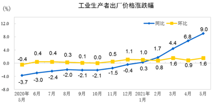 1、中国5月PPI同比增长9.0%,创2008年10月以来最大涨幅,再次超出市场预期。这个压力还是比较大的,因为工业品是很多行业的成本端,持续涨价的压力早晚会向消费端转移,进而造成通胀。所以也可以理解为啥政策面在持续的喊话控制大宗商品的上涨,严禁投机炒作行为,甚至还直接上调期货的日内交易费用来降温。