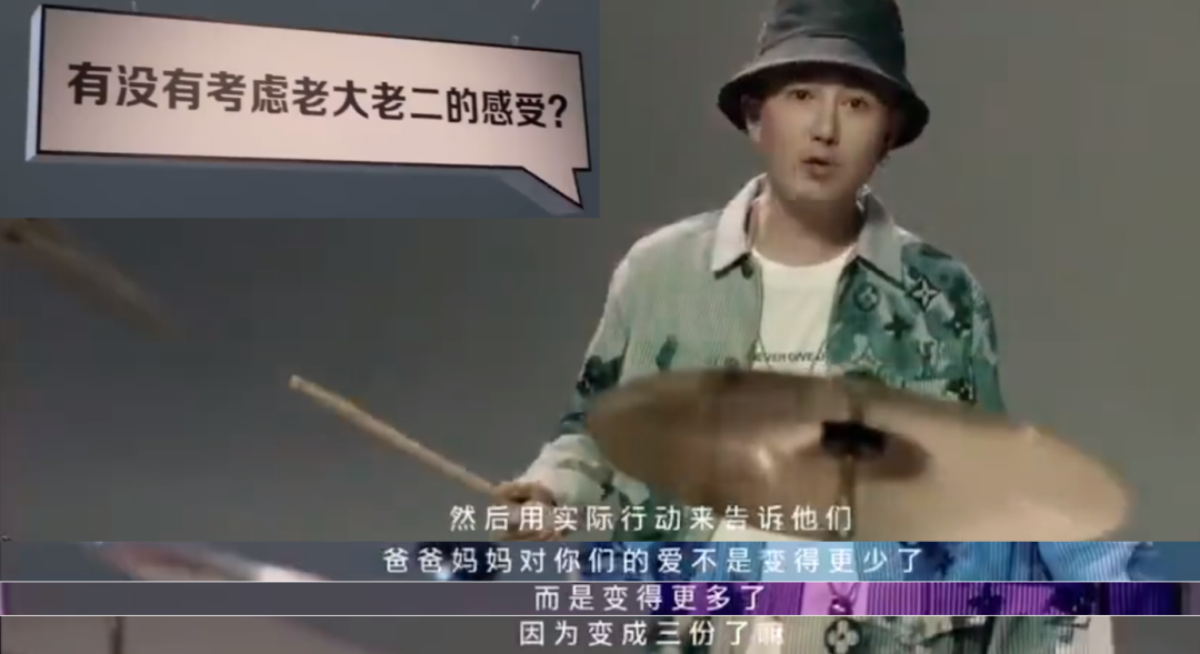第四个问题是“有没有考虑老大老二的感受?”这次得到的回答是“用实际行动来告诉他们,爸爸妈妈对你们的爱不是变得更少了,而是变得更多了,因为变成三份了嘛”。