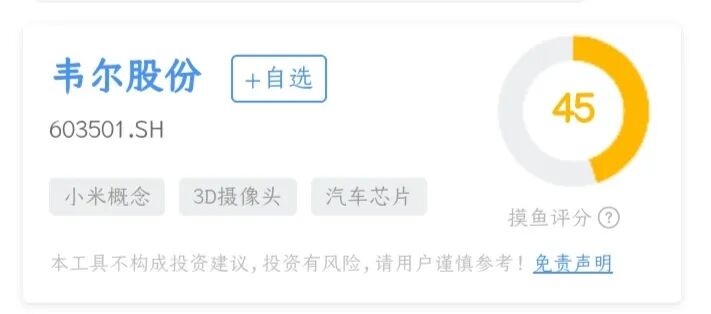 韦尔股份的摸鱼财报助手打分是45分,财务标签和风险提示可以点击下图查看: