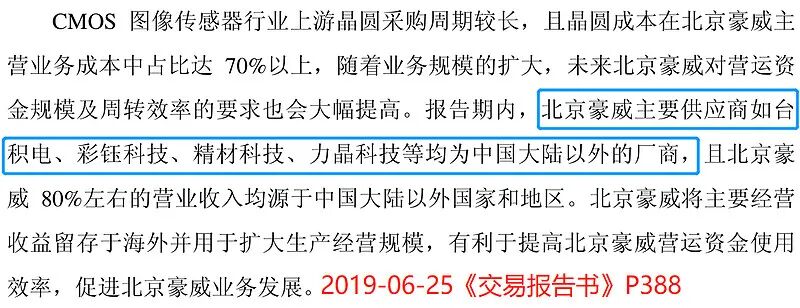 往IDM模式转向的原因一方面来自行业特性:“全产业整合资源以产生规模效应”,是索尼和三星这些国际同行、也是竞争对手的选择。另一方面更重要的是,核心子公司豪威的供应商主要位于境外,并且公司在《交易报告书》中也提及:在晶圆的“封测环节”存在单一供应商问题。