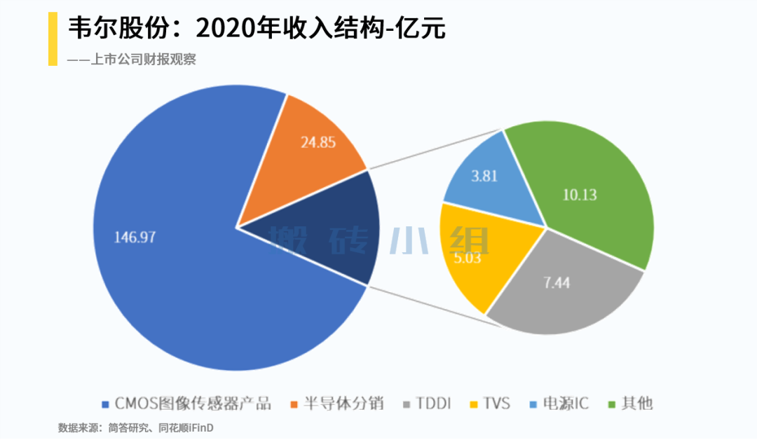 结合不断去化的存货,2020年公司收入规模达到198亿。至此韦尔股份最初的“半导体分销”业务占比降低到不足15%,CMOS传感器产品(下游客户包括手机、安防和汽车)成为核心收入来源,贡献了占比75%的147亿。