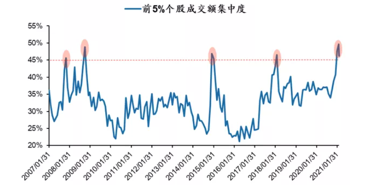 一般来说,机构常用成交额前5%个股占据全市场成交额的比例,作为追踪拥挤度的指标。从历史数据看,45%是个分水岭,一旦超过往往就会迅速回落。昨晚我统计了一下,发现这个数据已经来到了44.86%,极为接近分界点。