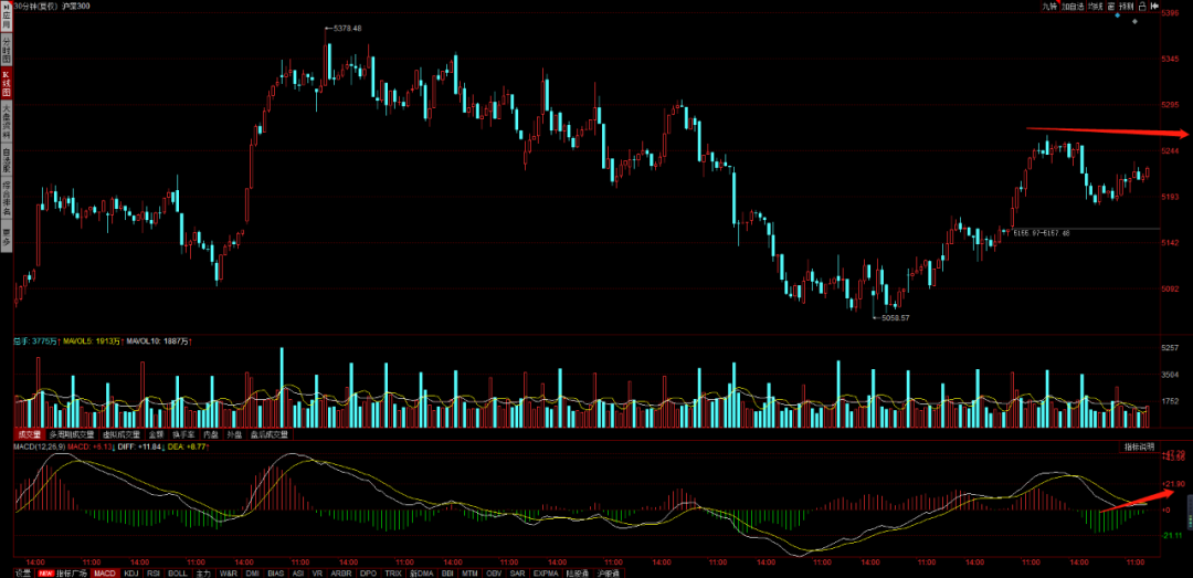 从图上看,今天这个反弹只能认为是30分钟调整结束后的一个小级别反弹,如果不能放量有效新高,那么市场压力是比较大的,当前位置不追高是前提。
