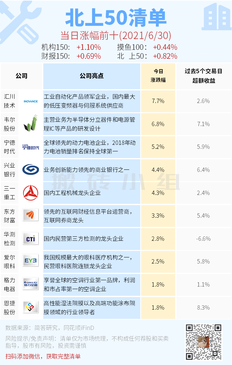 北上50榜单今天比较一般,榜一汇川昨天公告高瓴参与定增,现在这些业界大牛的带货能力真的十足,不过得到他们的认可,也说明公司有非常强的看点。