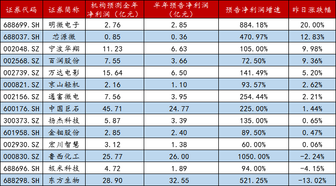 产业的火爆也反应到了业绩上,近两天芯片公司公布了很多分超预期的中报业绩,市场反馈也很积极。很多朋友经常问我怎么看是否超预期,这个要对比机构报告中的预期值,为了方便大家理解我把前天公布业绩预告的公司拉了张表,同时放上了昨天的涨跌情况。