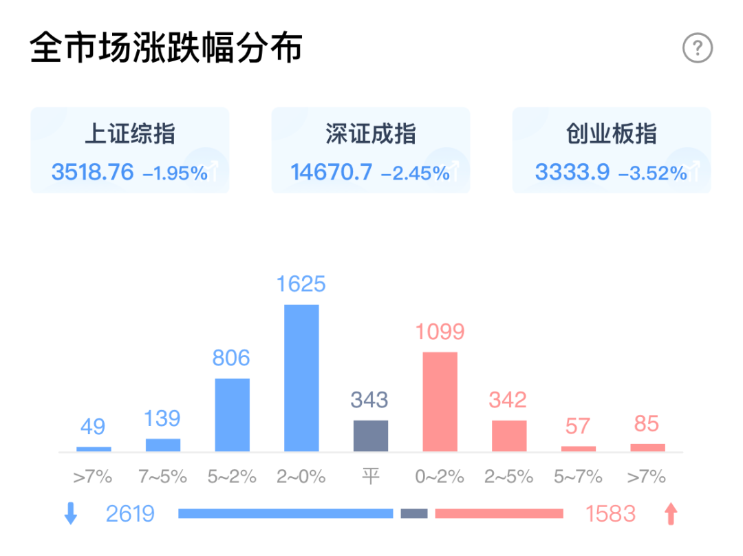今天市场表现非常惨烈,指数层面跌幅非常大,几个指数都收了根中阴线,而个股层面看下跌的有2600家,这比昨天倒是好一些,但总体看还是吃面行情。
