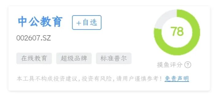 中公教育的财报打分是78分,财务优势标签和风险提示可以点击下图查看: