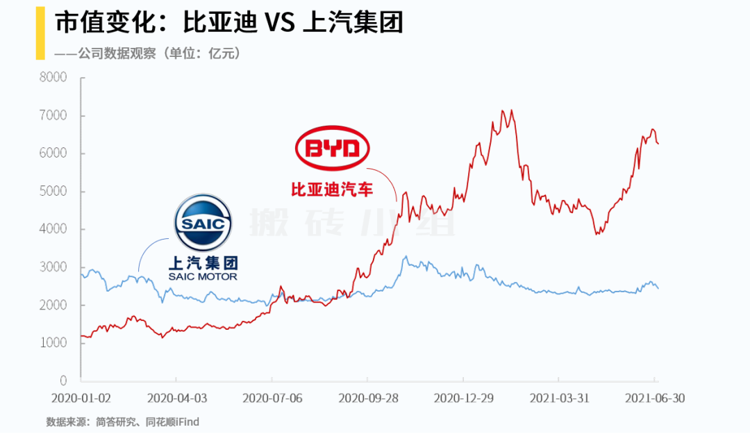 要知道,上汽本来在汽车板块的走势本来就比较另类,上汽曾是汽车板块龙头,销量第一,但从去年至今,比亚迪、长城市值涨了3、4倍,长安汽车、江淮汽车也是翻倍的走势,上汽同期还跌了12%,曾经的龙头现在市值不到比亚迪的一半,估值居然比净资产还要低……