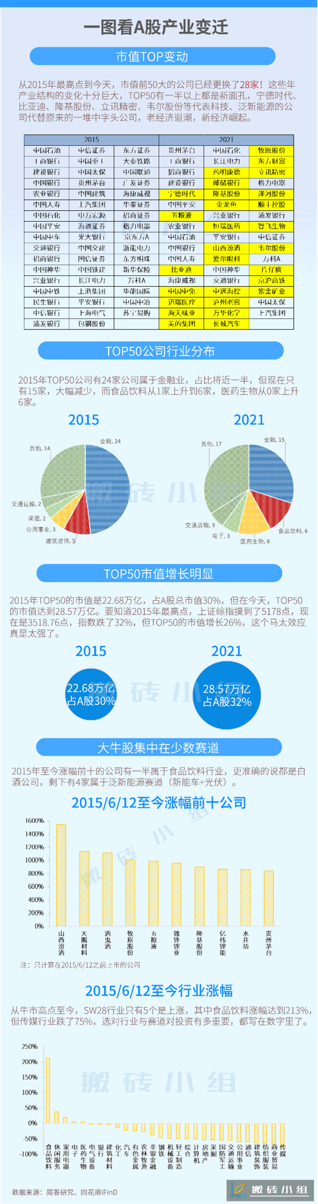 从2015年最高点到今天,市值前50大的公司已经更换了28家!这些年产业结构的变化十分巨大,TOP50有一半以上都是新面孔,这些新面孔的行业分布很有特点。