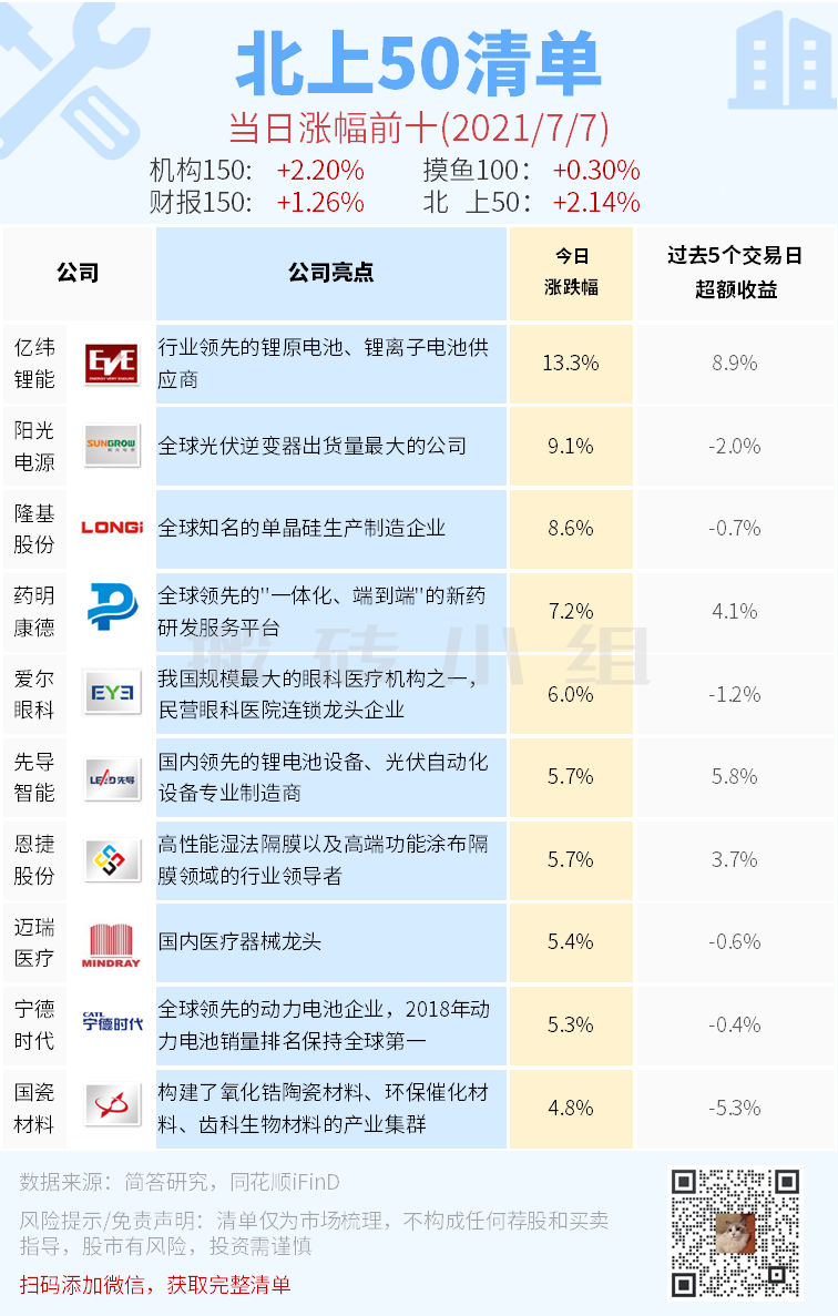 【北上50涨幅前10】