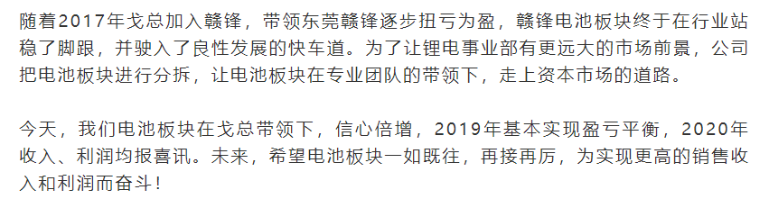 我们从赣锋自己发布的公开资料里找了找,戈到赣锋后,先组建起来技术团队,后组建了管理团队,基本就是说这一块业务都在他的掌控当中,随后带领公司锂电池板块扭亏为盈,并且收入、利润持续增长。